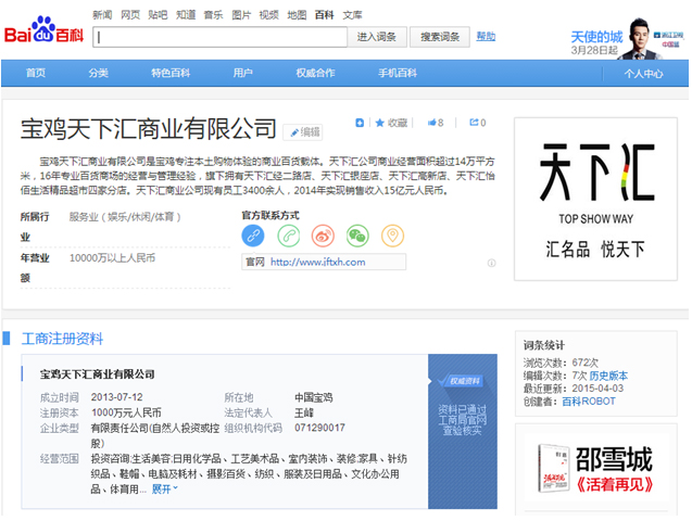 企業(yè)百科于2015年3月30日改版。新版企業(yè)百科年費(fèi)6998元,功能如下: